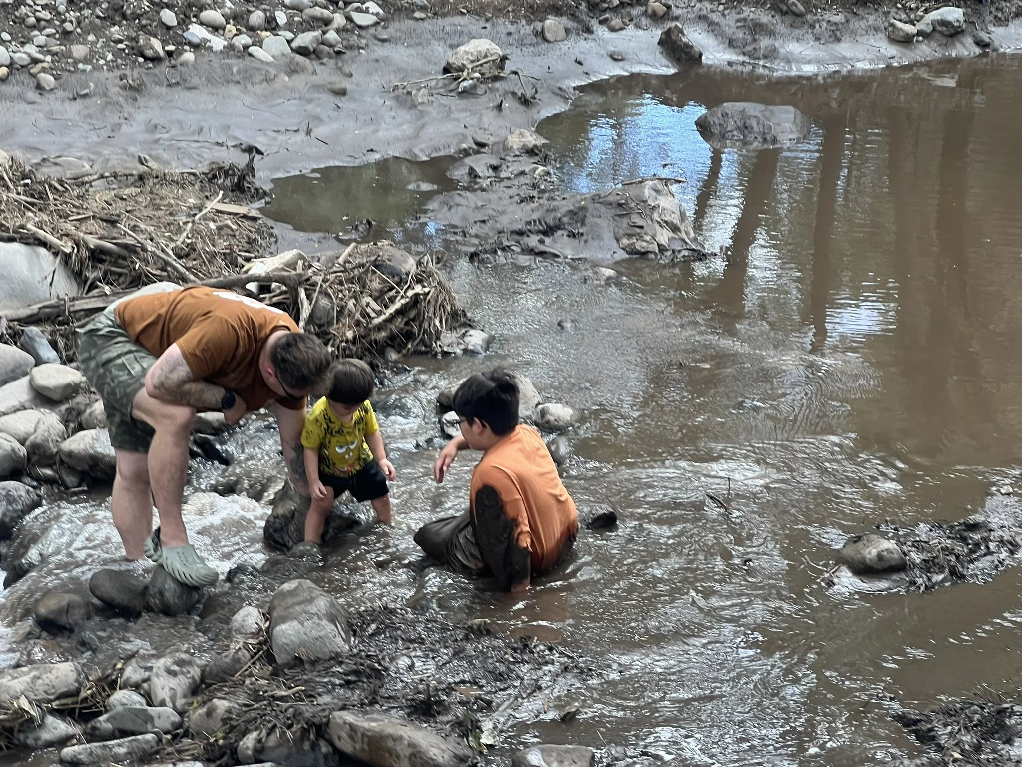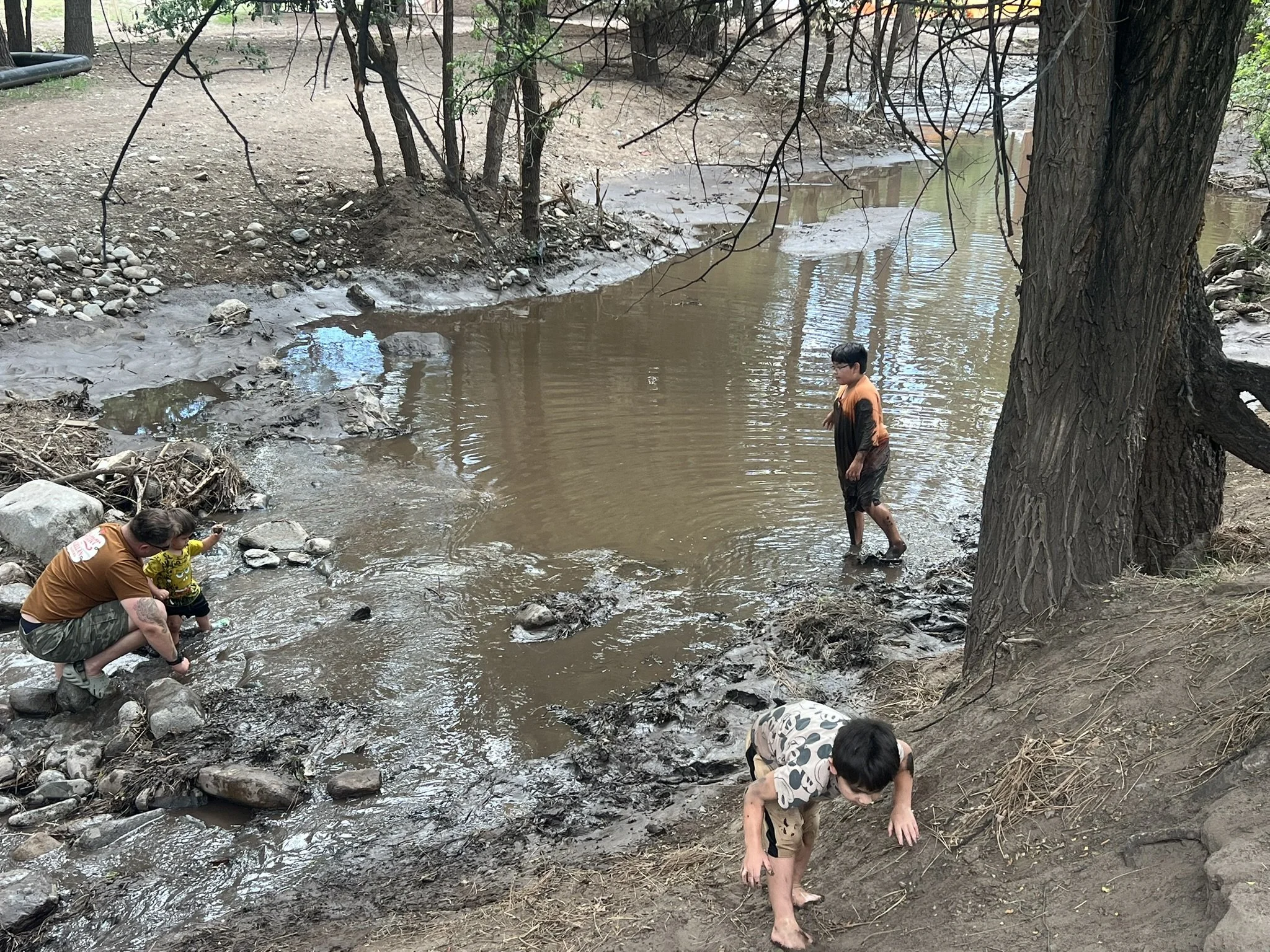 Jordan, Landon and Chase Adams enjoy exploring the creek bed of Rio Ruidoso on June 11, 2025, in spite of the continued presence of silt in the water. (Photo by Elva K. Österreich/ SNMJC)