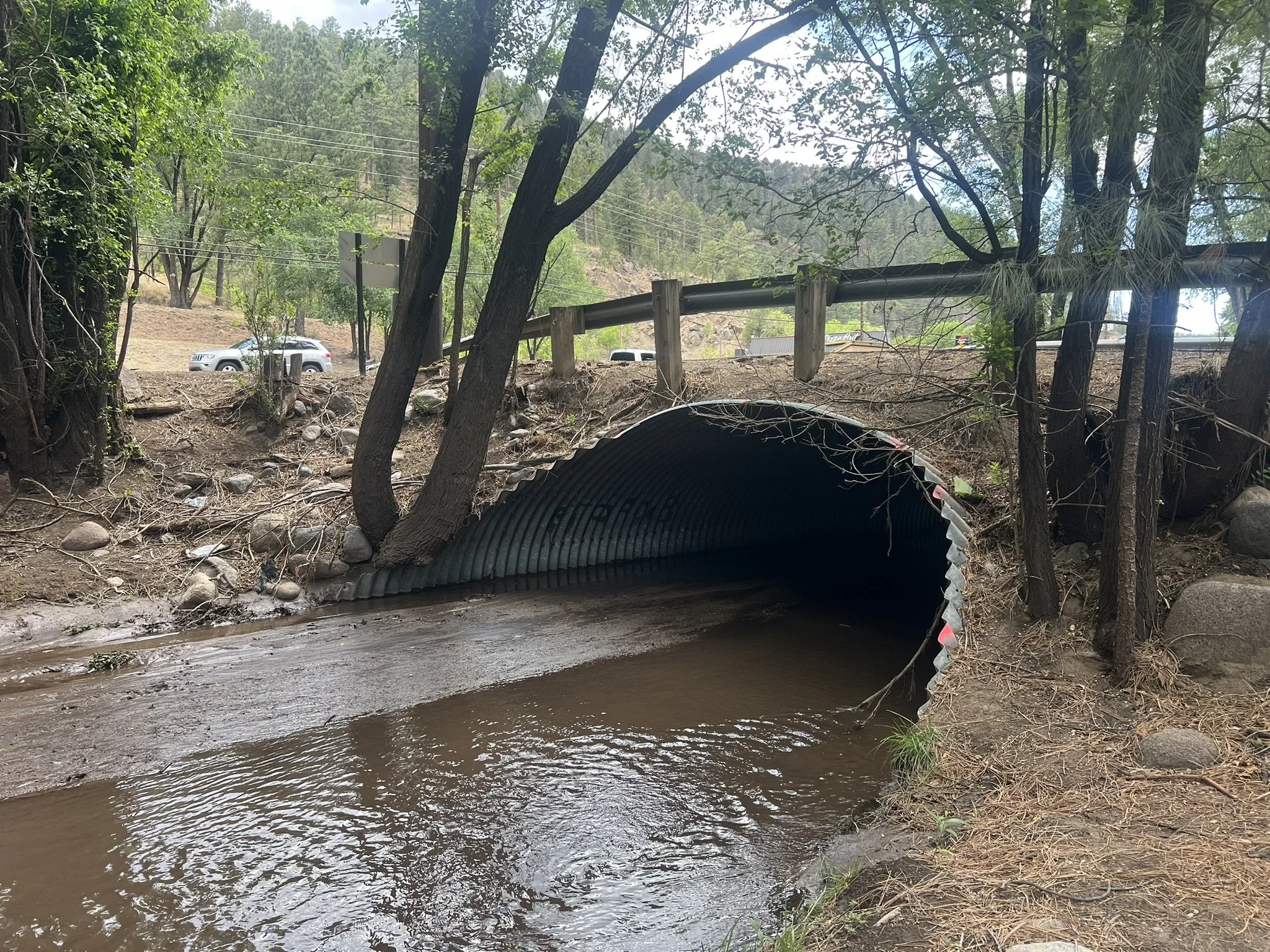 On June 11, 2025, silt crowds the Rio Ruidoso culvert below the Ruidoso Visitor Center, where desilting has yet to be started. (Photo by Elva K. Österreich/ SNMJC)