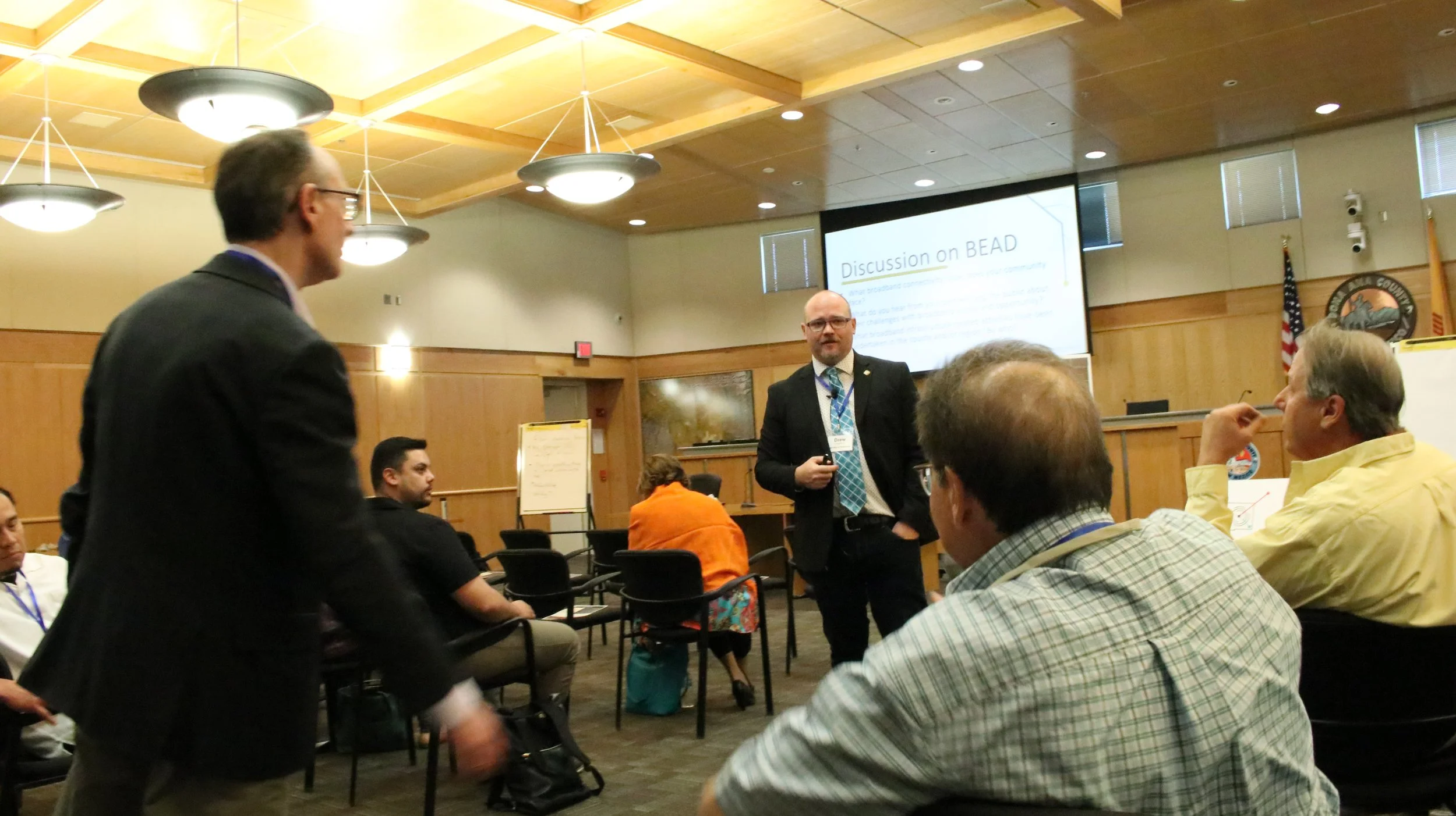 Nicholas Prince, left, councilor for the town of Silver City, leads a breakout discussion about internet needs in Southwest New Mexico during a meeting hosted May 12, 2023, in Las Cruces by the state Office of Broadband Access and Expansion. (SNMJC)