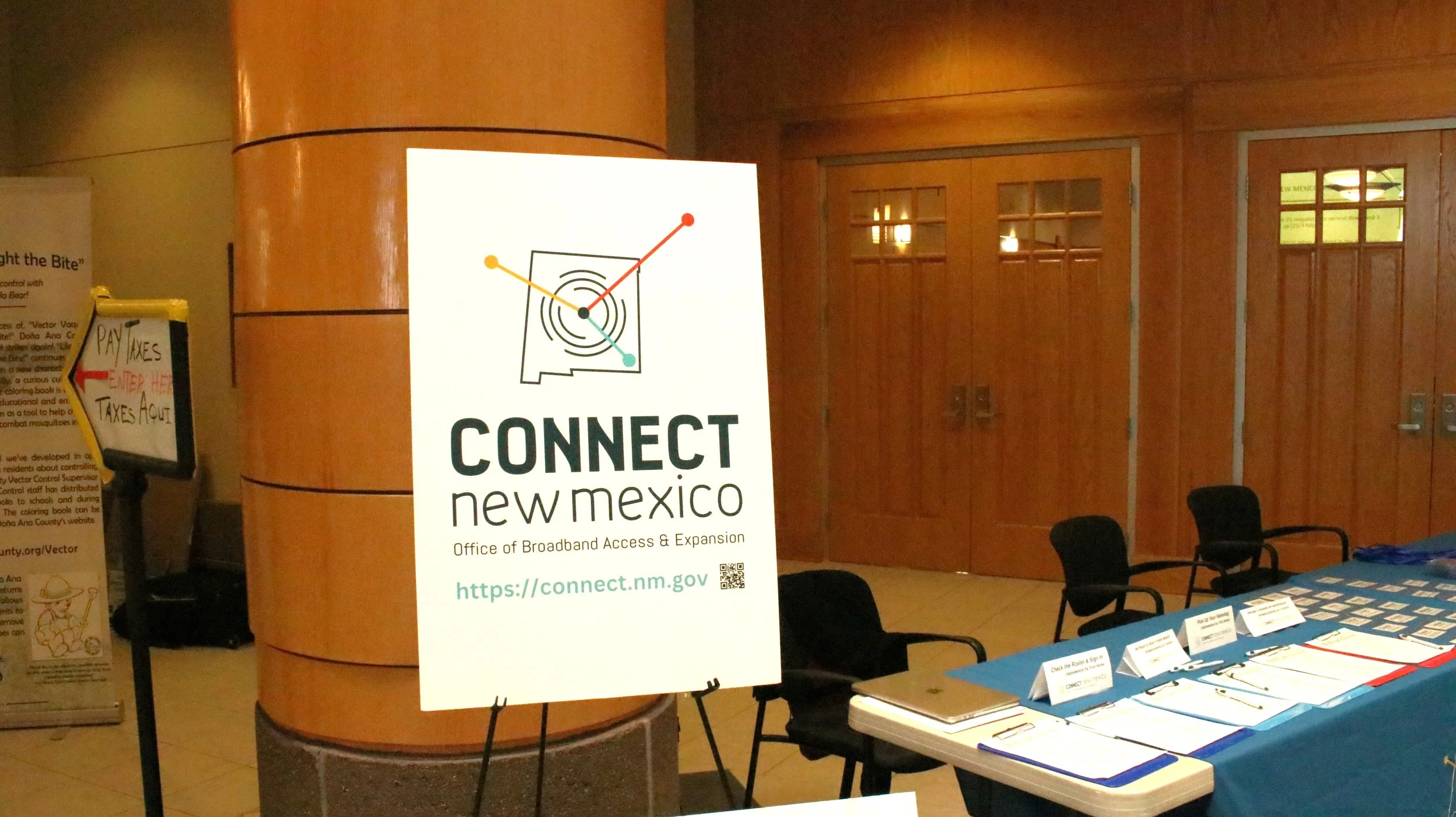 Outreach efforts like public meetings and advertisements have helped boost the numbers of residents enrolled in a federal subsidy, known as the Affordable Connectivity Program, to help pay for internet subscriptions. A poster from a New Mexico effort backing broadband expansion is seen during one such public input session Friday, May 12, 2023 at the Doña Ana County Government Center, 845 N. Motel Blvd., Las Cruces. (Photo by: Diana Alba Soular/ SNMJC)