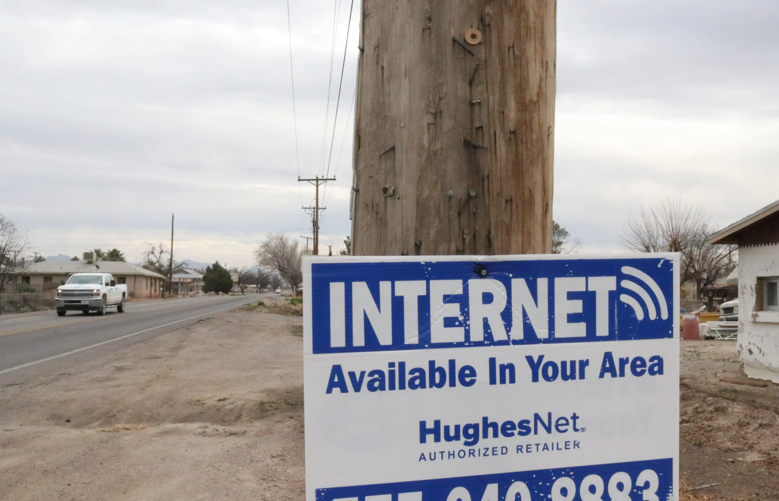 PHOTO: A poster advertising satellite-based internet service is seen Dec. 9, 2022 in the farming community of La Mesa, 17 miles south of Las Cruces on N.M. Hwy. 28. New Mexicans face a Friday, Jan. 13 deadline to verify their internet speeds on a federal broadband map – a step that will be key to getting funding for faster internet in the future. (By Diana Alba Soular/ Southern New Mexico Journalism Collaborative)