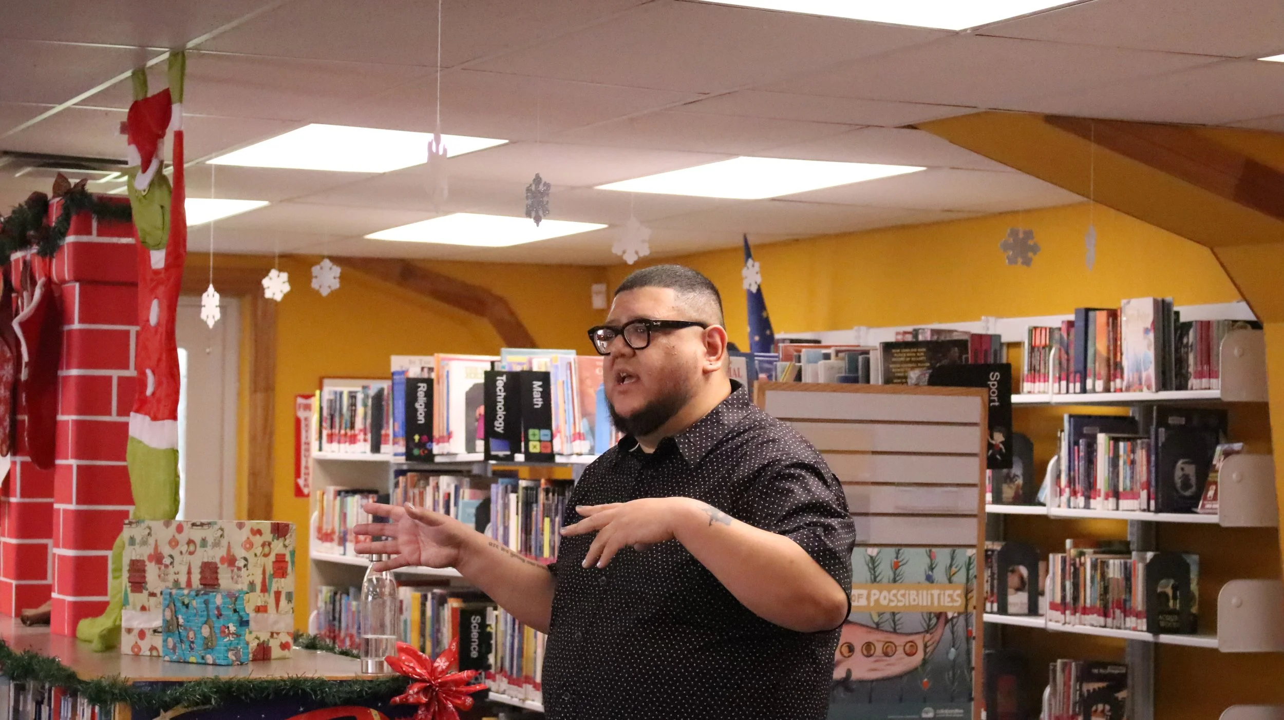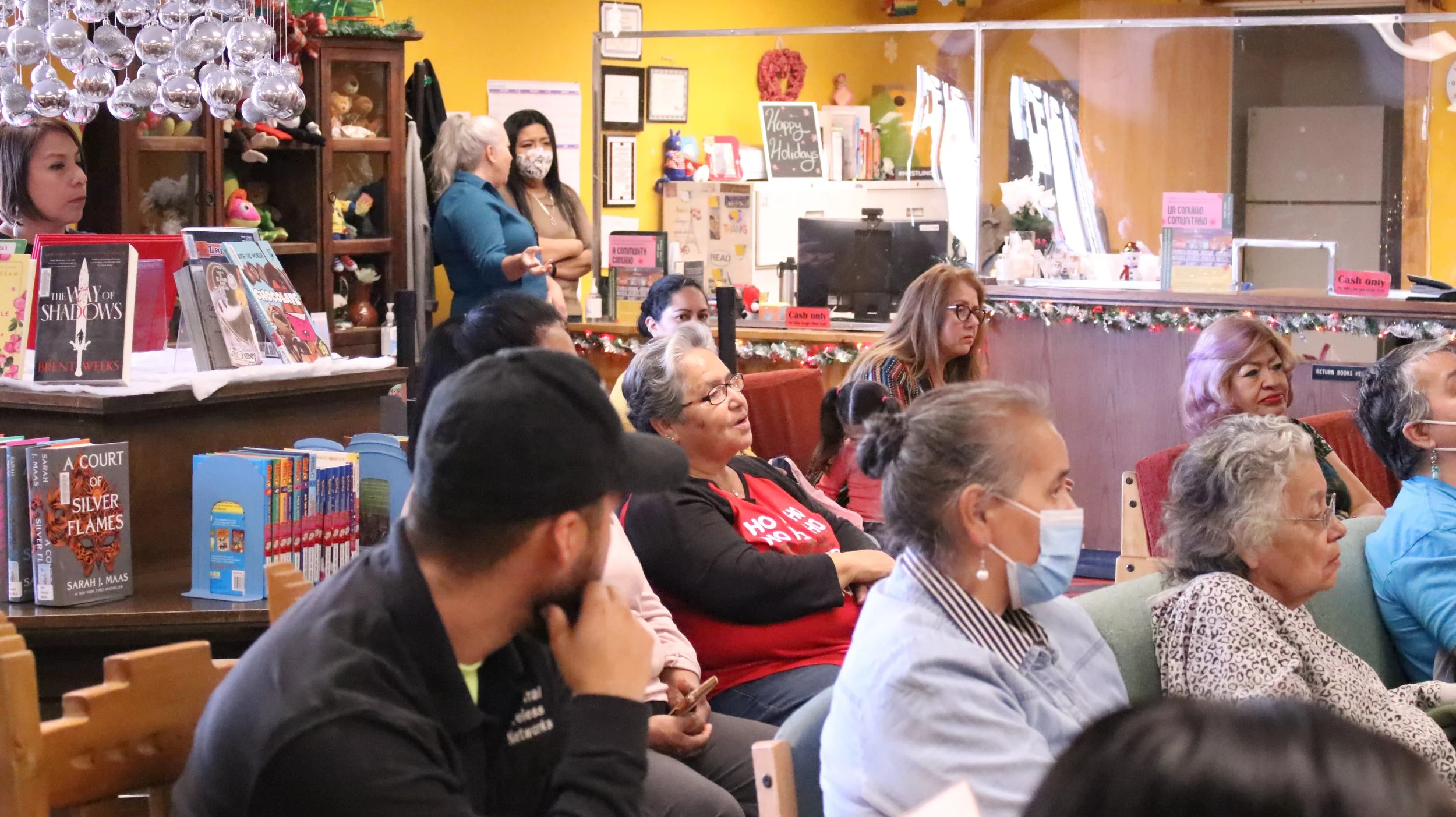 Amid bookshelves and bulletin boards trimmed with Christmas decor, about 40 residents filled the center of the library’s main room, as Vazquez introduced himself in Spanish. Some posed questions and had a back-and-forth discussion with Vazquez and Chaparro. The party concluded with door prizes in the form of gift cards and t-shirts featuring the Mamacitas Cibernéticas logo.